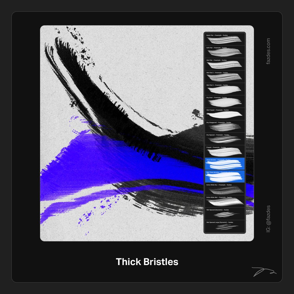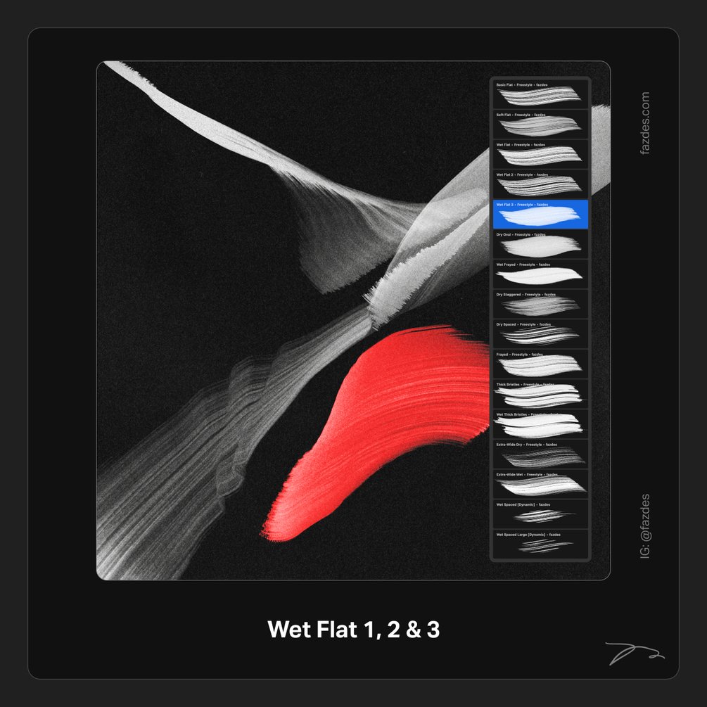 The new Freestyle Abstraction III [updated set] brushset for Faz's Freestyle approach. Create unique abstract lettering and paintings using this bundle. This package includes 16 Procreate brushes (Freestyle, broad, flat, grainy wet and dry brushes–see images), plus 4 light/dark 4K procreate paper template files where you can get started.