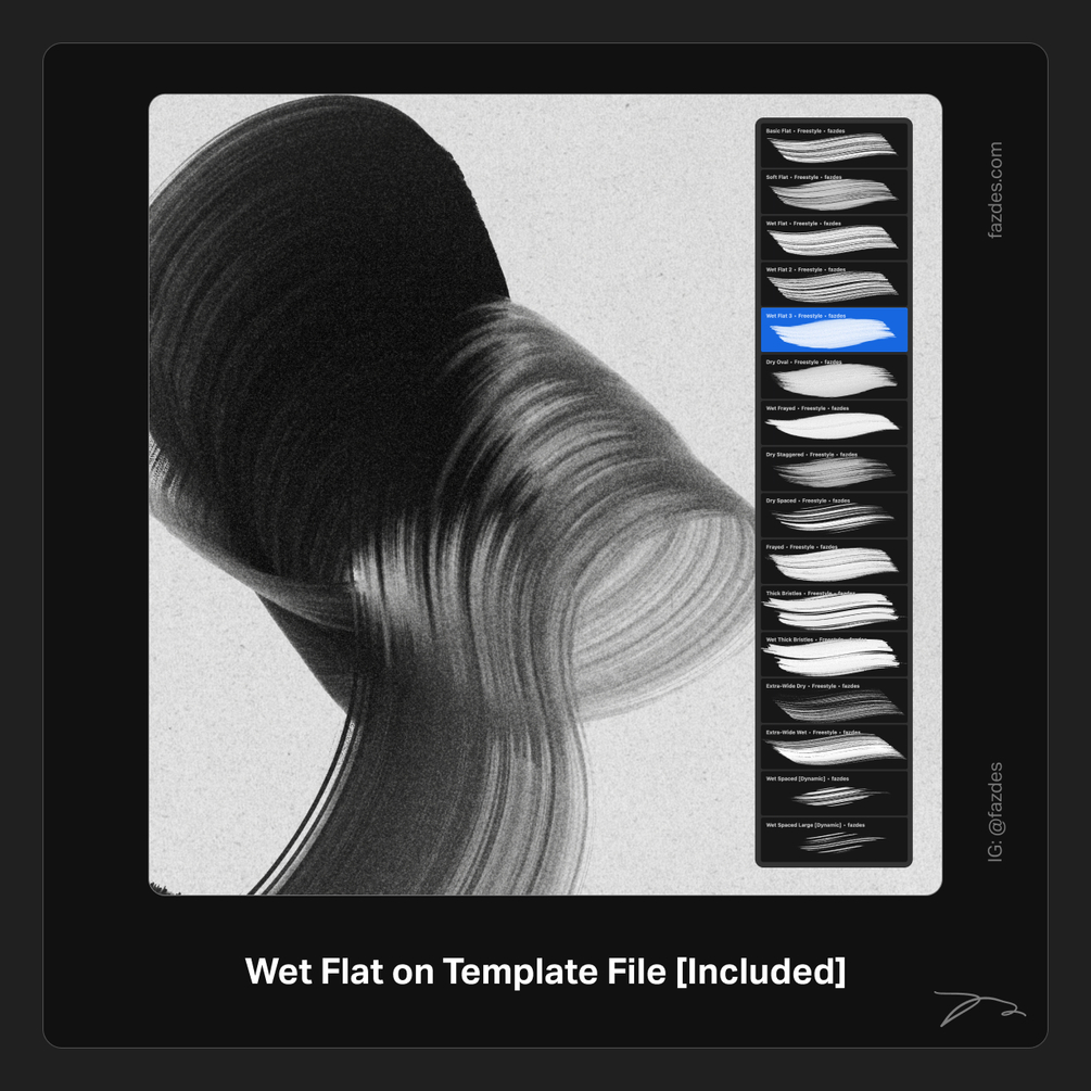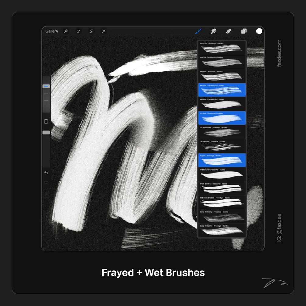 The new Freestyle Abstraction III [updated set] brushset for Faz's Freestyle approach. Create unique abstract lettering and paintings using this bundle. This package includes 16 Procreate brushes (Freestyle, broad, flat, grainy wet and dry brushes–see images), plus 4 light/dark 4K procreate paper template files where you can get started.