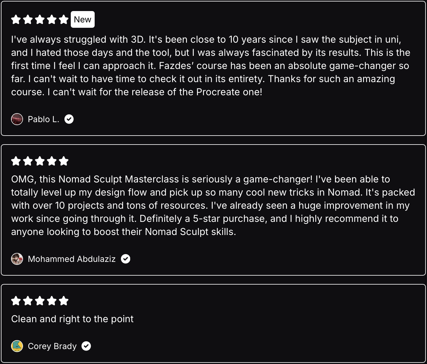 This course is built around my personal design workflow — how I approach composition, visual flow, lighting, and every stage of sculpting in Nomad. From the basics to advanced pro tools, you’ll get a hands-on look at how I think, build, and take creative decisions.